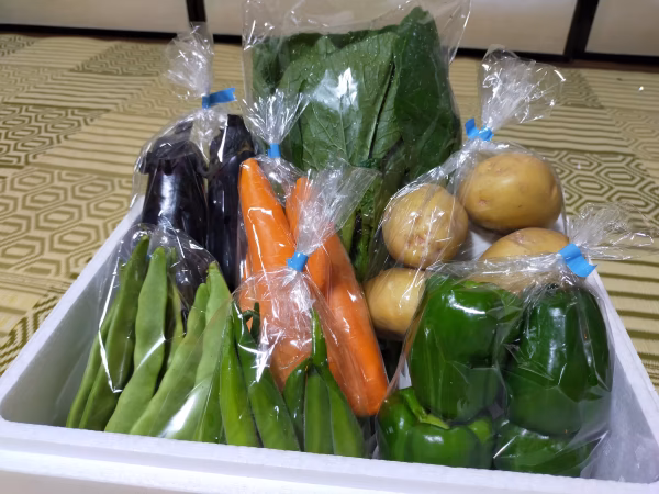 茄子、ズッキーニ 、キュウリ、人参、オクラ、つるむらさき、小松菜、べんり菜、じゃがいも、ピーマン、モロッコいんげん、三尺ささげ、南瓜、スイスチャード