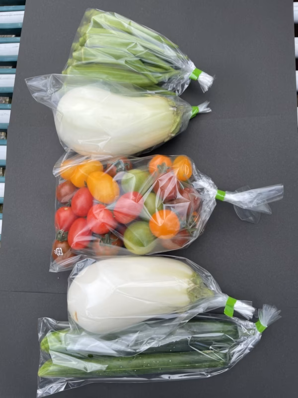 食べ切りセットにしていますが、ミニトマトとオクラは多めに入れます。キュウリは2〜3本入り、白茄子は2個入りです。