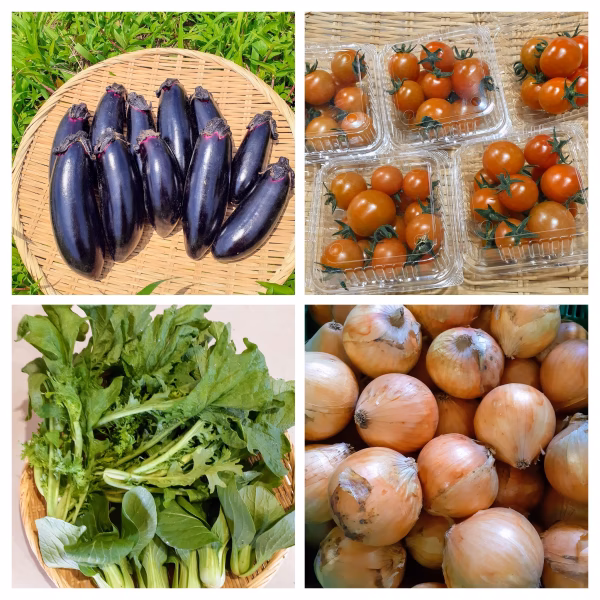 有機玉ねぎ、有機ミニキュウリ、有機なす、有機ミニトマト、わさび菜、ミニチンゲン菜、コールラビ、いんげん、有機オクラ(緑・島赤)、バジルなどハーブ類、など