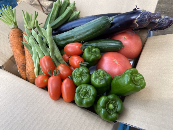 現在栽培中のお野菜(王様トマト・アイコミニトマト・オクラ・インゲン・スティックセニョール・ふわとろナス・きゅうり・ピーマン・パプリカ・空芯菜…)収穫適期のお野菜お任せセット。