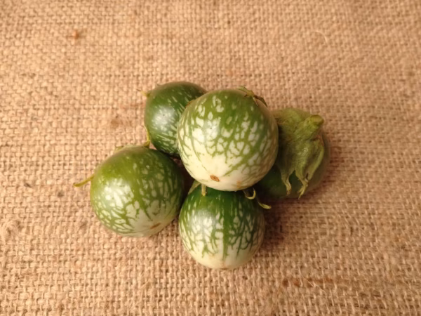 ▼商品概要 東南アジア、タイ等でポピュラーな小さなナスです。 グリーンカレーはこのナスが使われています。 ▼品種・味の特徴・食べ方 東南アジアで『マクアプロ』『マクアポ』等と呼ばれています。 グリーンで、白の模様が入ってかわいい。 皮は厚く、バリっと歯応えがありますが、東南アジアの料理に合う性質です。 本格的なグリーンカレーに。 また、生でサラダなどにも使われます。 タイの人は畑で生のままかじって食べるそうですが、日本人の私にはそれはちょっとマニアックな味でした。 塩もみ、浅漬けは美味しく食べられました。 ※日本のナスと違い、大きく育つとタネがたくさん入りますが、東南アジアの方は気にせず、それも愛好するようです。 ▼数量、分量の目安 直径4〜6cmの実30g〜50g (目安として200gで4から6個です) ▼栽培/生産方法、こだわり 有機質肥料を主体に育てています。 とても強健な品種で、あまり手間がかかりません。農薬の使用は控えめです。