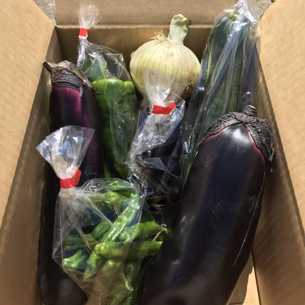 大長ナス、ズッキーニ、ジャンボピーマン、ししとう、紫ししとう、たまねぎの計6種類のセットになります!
