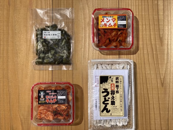 - うどん:小麦粉(国内産)、塩、加工デンプン メンマキムチ:メンマ(中国産)、大根、ネギ(越谷市産)、にんにく、上白糖、ニラ、桃果汁、昆布だし、食塩、鰯エキス、鰹エキス、カナリエキス、アミの塩辛、調味料(アミノ酸等) 白菜キムチ:白菜、大根、唐辛子、ネギ、ニンニク、砂糖、塩、ニラ、昆布、生姜、アミの塩辛、鰹エキス、カマスエキス、還元水飴、洋梨果汁、アミノ酸等、酒精 きゅうりの押漬:胡瓜(埼玉県産)、生姜、おから、塩