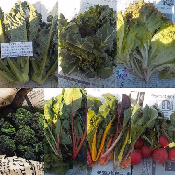 ほうれん草、小松菜、つぼみ菜、スイスチャード、春菊、水菜、ミニキャベツ、サラダリーフ、人参、キュウリ、トマト、ラディッシュ、ミニ大根、白かぶ、ゴボウ、ネギ、玉ねぎ、じゃがいも、サツマイモ、里芋、