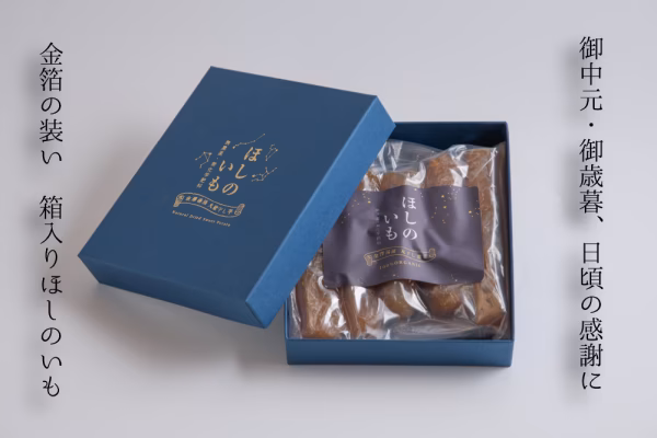 ご贈答用に箱に入ったほしのいも。金箔で装いを施した普段とは違う特別なひと時に。