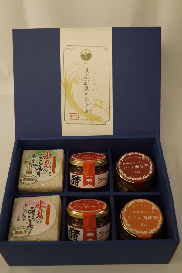 ▼自己紹介 岡山県新見市哲西町大野部でお米の生産、加工品、野菜栽培、和牛繫殖を営む農地所有適格法人 株式会社 米見です。大自然に囲まれた山奥で本当に美味しいものを作り続けいています。  ▼商品概要 弊社商品の詰合せ美味しいお米の副材として、ジビエ肉味噌又は、猪食べるラ-油をトッピング。食がすすみます。 ▼品種・味の特徴・食べ方 ご飯のおとも、お酒のおとも、調味料としてぜひご賞味ください。 ▼数量、分量の目安 内容量:コシヒカリ300g×1個 あきたこまち300g×1個     ジビエ肉味噌甘口120g×1個 ジビエ肉味噌辛口120g×1個     猪食べるラ-油110g×2個 ▼栽培/生産方法、こだわり 「自信」私たちの生産した農産物は、大自然の恵みを自信を持ってお客様に提供します。 「自慢」私たちの生産した農産物は、どこよりも良品質であることを、自慢出来ます。 「努力」私たちは日々努力し、品質管理を行うことで安心安全を提供します。 「前進」私たちは新しい創意工夫を行い、地産地製品による、地域社会貢献を行います。 ▼注文に際しての注意点(配送方法や納期指定など) 配送日時指定について;日時指定を承ります。 ※天候等の生産現場における事情や、運送会社の都合による配送遅延が発生する場合もあります。