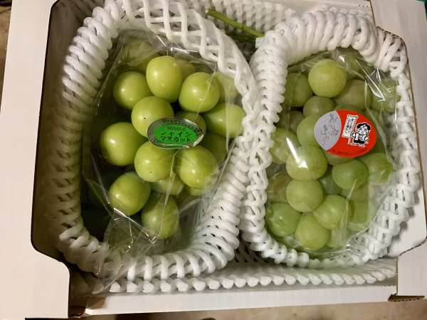マスカットの香りのするシャインマスカットと皮の薄いパリパリ食感の桃太郎ぶどうです。