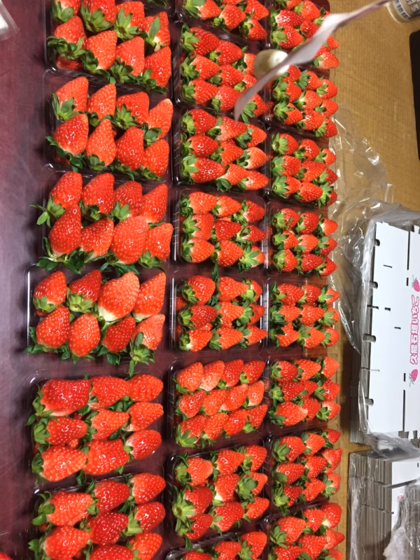 小粒〜普通サイズのイチゴを2段で1パックにします。1パックに12粒〜20粒程度になります。