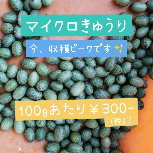 栽培期間中はお薬使用しておりません。 種を紡いで4年目、今年は天候に恵まれ、これまでの栽培で1番たくさん収穫できています😊✨ マイクロきゅうりちゃん、露地栽培では収穫量の増減がすごく激しくて、暴風にも弱いし、収量を増やすのが結構大変なのです😭💦 今ピークです😊✨ そのままサラダや付け合せ、ピクルスにしても◎ 可愛くて目を引きます💕 爽やかな香りと、ライムのような酸味、そしてスッキリしたほのかな甘みのきゅうりです♥ ※マイクロきゅうりちゃんの調子が悪くなる時は一瞬です。暴風の次の日には枯れはじめる事もあります😫💦穏やかな(そろそろ雨がほしいです☔)今のうちに、ぜひお召し上がりいただきたいお野菜です🎶✨ ※100gでお写真4枚目の一袋分になります。  写真では、数袋並べて撮影しております。 ※配送は、この季節お野菜の傷みを少しでも防ぐ為にクール便でのお届けとなります🙏