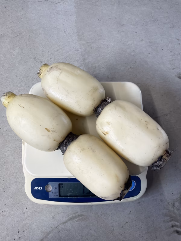 〇商品紹介 今期の収穫を始めたばかりの 新蓮根です! 今の時期は若くて白くてやわらかいシャキシャキ蓮根。 甘みたっぷりの蓮根です。 今の時期限定の食味をお楽しみ下さい! 白石蓮根の中でも福富地域の知る人ぞ知る「福富蓮根」 うまみ、甘みたっぷり! 蓮根の味には自信があります! 新蓮根本来の白さで、もちろん無漂白です。 全集中で心を込めて作った自慢の蓮根、 たくさんの方に食べて頂きたいです! 〇分量、目安、商品概要 ・1kg〜1.5kg入り ・300g〜350g前後の蓮根が4節入ってます ・大きさは計りの上に乗せた写真を参考にされて下さい。 ※鮮度を保つため、泥付きでお届けします。   〇味の特徴・食べ方 蓮根は切り方でも食味が変わります。 同じ料理で輪切り・縦切りと両方の切り方で違いを楽しんでみて下さい。 サラダや天ぷらにお勧めです! 〇発送方法 鮮度を保つために泥付きで出荷します。 専用箱にいれて発送しますので、 プレゼントやお返し等にもそのまま渡していただけますよ。 〇注文に際しての注意点(配送方法や納期指定など) ご注文後3日以内に発送予定ですが、天候・こちらの事情により 1週間ほどお時間を頂く場合があります。 ※今の暑い時期はクール便(冷蔵)にて発送させて頂きます。 通常運賃900円+クール料金275円=合計1,175円