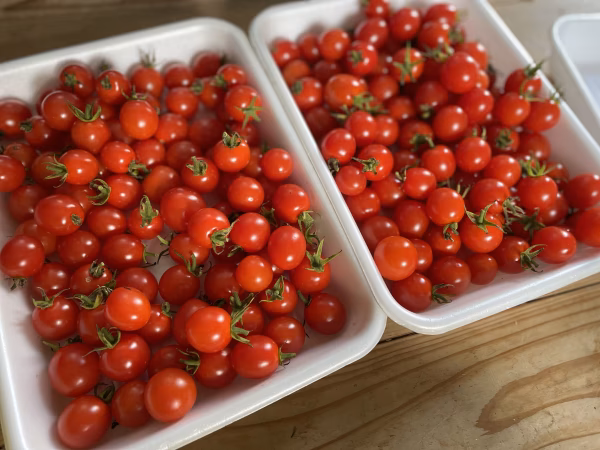 ルビートマトという小粒(10-20g)で甘くて深紅の農薬化学肥料不使用高糖度トマトです。
