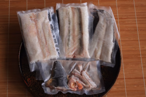 調理しやすいように、「身」と「頭+中骨+内臓」に分けて真空パックしております。