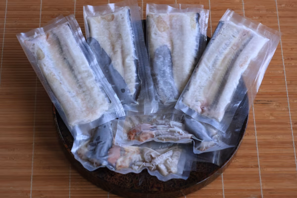 調理しやすいように、「身」と「頭+中骨+内臓」に分けて真空パックしております。