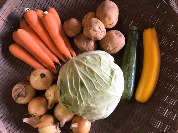 よく使う野菜の代表選人参、玉葱、じゃがいも(キタアカリ)、キャベツのセットです。もう一品、ズッキーニなどオマケに入ります。