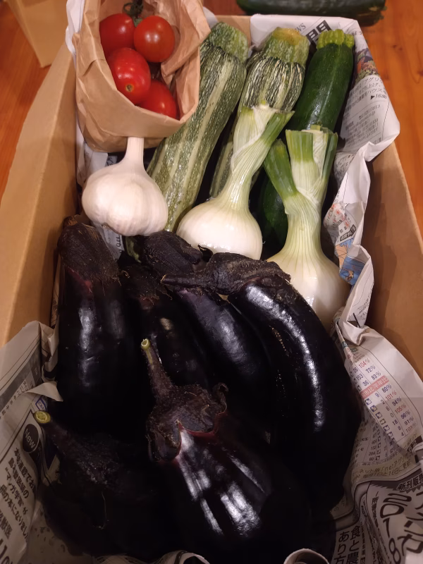 ナス、水なす、新玉ねぎ、生にんにく、ズッキーニ、おまけの野菜が付きます。(指定はできません。)