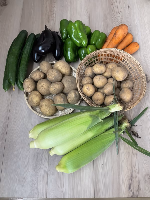 80サイズの箱に、とうもろこし4本と、おまかせ野菜3~4種類を入れてお届け致します。