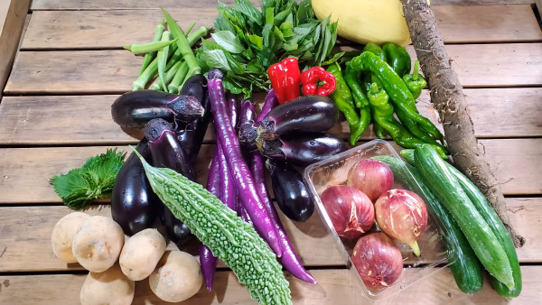 なばな、新玉ねぎ、春菊、原木しいたけ、スティックセニョール等