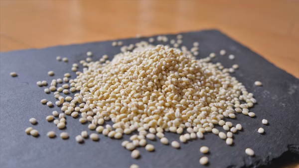 ▶私たちは、収穫後の加工(精麦)も自分たちで行っています。精麦では、麦の表面の皮を約3割削り、より美味しく召し上がって頂ける状態にします。この加工作業は、一度に7kgほどしか生産することができず、3時間ほどの時間を要します。しかし、この作業は非常に重要で、《キラリモチ》の最大の特徴である、白さが際立つ仕上がりとなり、加熱処理後も色が褐変しにくくきれいな薄い黄色味がかった白色をしています。