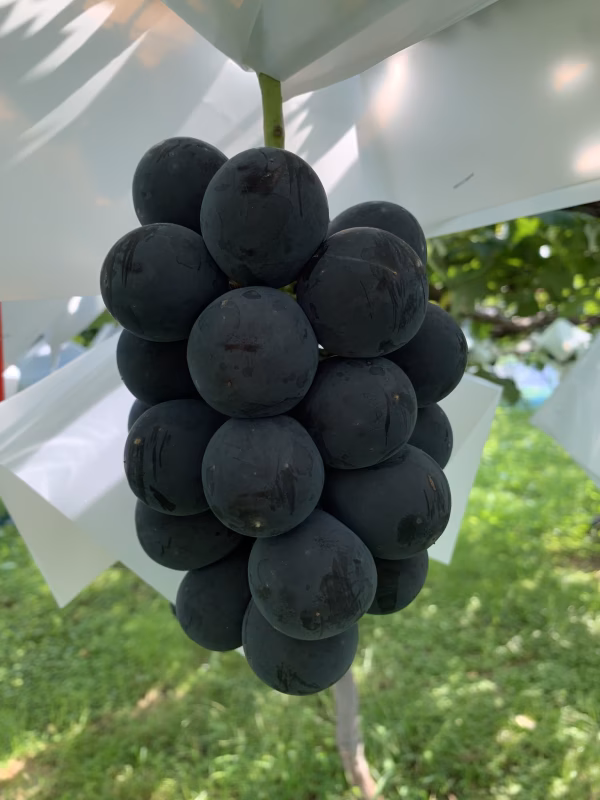 粒は巨峰の1.5倍〜2倍大きく、色は黒く、果汁はジューシーで濃厚な味わい。正に「黒王(ブラックキング)」。