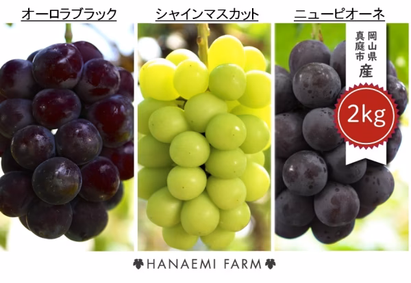 定番になりました美味しさ間違いなしのピオーネ、シャインの2種類に加えて、岡山が売り出し中のオーロラブラックを合わせたセット品です。