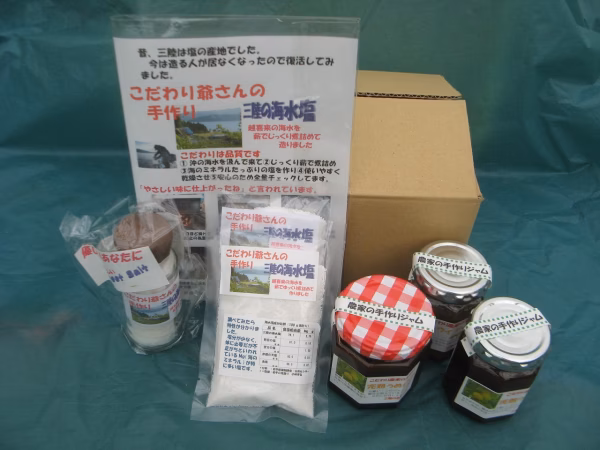 ▼品種・味の特徴・食べ方:海からは越喜来湾の海水を煮詰め手作りをした海水塩、里からは地産の梅とキウイフルーツのジャムを送ります。