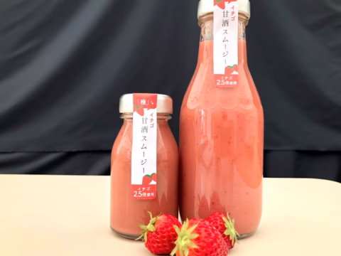 「甘酒が体にいいのは知ってるけど粒々がちょっと苦手」という方にも手にとっていただけるように、麹甘酒特有粒々感をペースト化し、またイチゴの比率を甘酒に対し2.5倍とすることで、甘酒が苦手な方にも飲んでいただけるように開発しました。またイチゴが豊富に入っていますので、イチゴ好きの方に満足していただける味わいになっています。