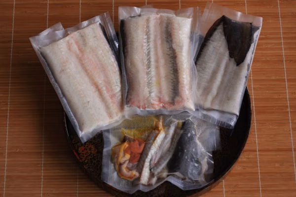 調理しやすいように、「身」と「頭+中骨+内臓」に分けて真空パックしております。