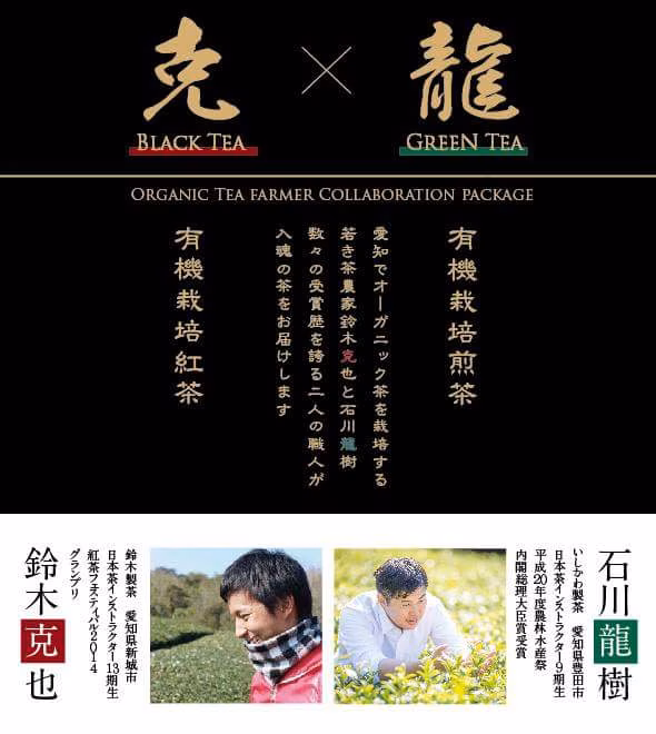 愛知県の山間部で有機JAS認証茶を栽培しているいしかわ製茶の石川龍樹のオーガニック煎茶と、鈴木製茶の鈴木克也のオーガニック紅茶のコラボ商品です。