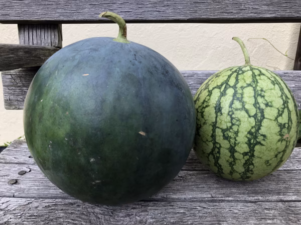 訳あり、お買い得な、少し小さめの「タヒチ」と黄小玉すいかのセットです。