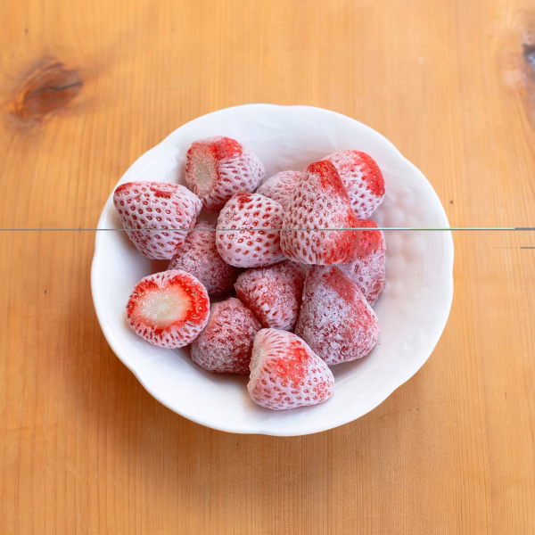 真っ赤に完熟した粒だけを朝採りして、数時間以内に急速冷凍した冷凍イチゴです。