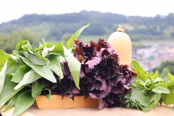 内容⇒①赤しそ 250g②空心菜 200g③つるむらさき 200g④大葉 枝付き 150g ⑤バターナッツカボチャ 1個 です。一人暮らしから4人家族まで対応可能です!