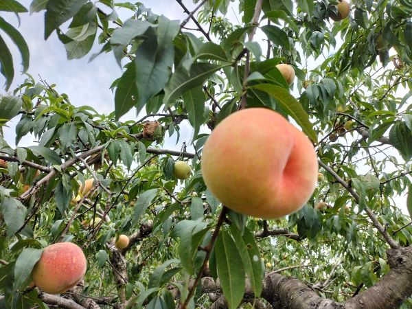 従業員の気転もあり農薬不使用で成功した桃。この喜びを皆様とも共有できれば、私たちもこの上ない幸せです。