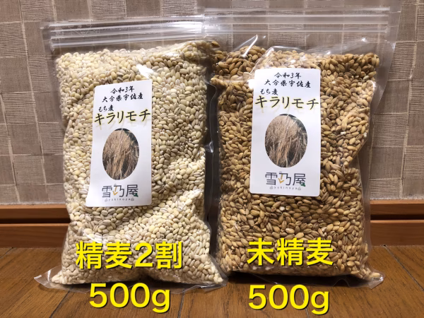 精麦2割のキラリモチ1kg(500g×2袋)と未精麦1kg(500g×2袋)合計2kgの食べ比べセットです。プチプチとした食感は、未精麦の方がより感じられます。その反面、消化吸収が精麦済みのものより劣ります。