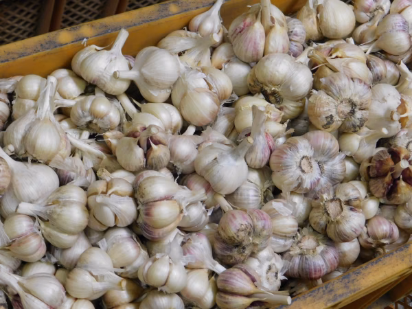 - にんにくの見た目ですが、スーパーで販売しているような外の皮がたくさん残っている状態ではございません。ほとんどむけている状態の物も多いです。今年から冷蔵を使えるようになったので現在発送している物は収穫乾燥後一旦冷蔵庫で保存したものになります。冷蔵庫から出した時の気温差でにんにくの皮が少し湿ってしまい再び乾燥した時ににんにくの1枚外側にある厚めの皮が割れてしまっている物もございます。 にんにくの植え付け時期になってまいりました。にんにくも休眠が明けて少しですが発根しているものもございます。ご理解の程宜しくお願い致します。