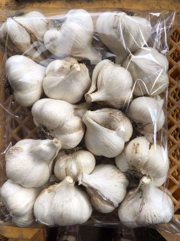 今年6月に収穫した青森県産にんにくです。形が不揃いのものや、変形、皮が破けているものが含まれています。粒は大粒が多くはいっています。