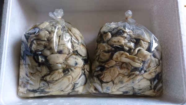 むき身1kgを2袋でお届けします。そのまま冷凍でしたら発送する袋で大丈夫ですが(少し膨らみますので、キチキチでゴムをしてしまうと破裂する場合がありますので余裕を持って口を閉じてください)、小分けに冷凍する場合は冷凍用のジップロックをご使用ください。