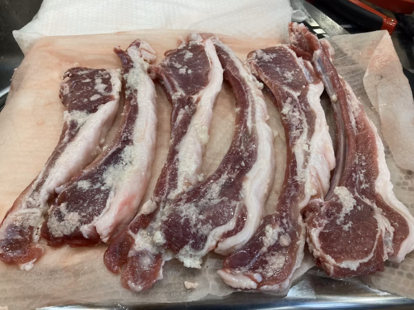 ジビエは筍を主食に育ったオスのイノシシ、アバラ部分を骨付きで塩こうじに2日間漬けた後真空パック冷凍した骨付きロース(カタロース)・バラ塩こうじ漬けです。