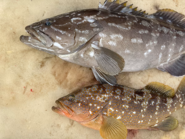 松島近海の漁場ではえ縄漁で釣り上げたクエとキジハタです。