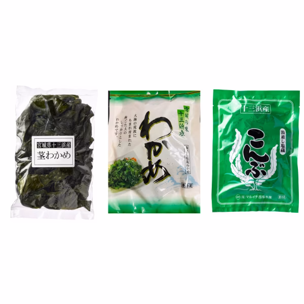 - ◎わかめ わかめ(宮城県産)、食塩 ◎茎わかめ 茎わかめ(宮城県産)、食塩 ◎塩蔵こんぶ 昆布(宮城県産)、食塩