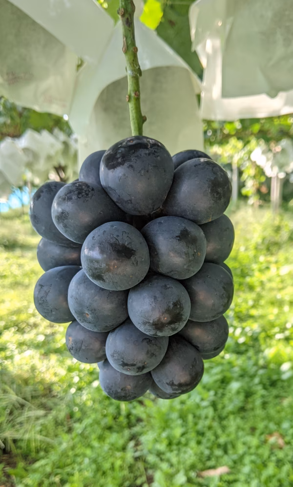 完熟ぶどうは、粒の色が黄色味を帯びてきます。また、ぶどうにも一房一房個性があり、房の大きさや形、粒の大小、粒表面のシミなどがあることがあります。