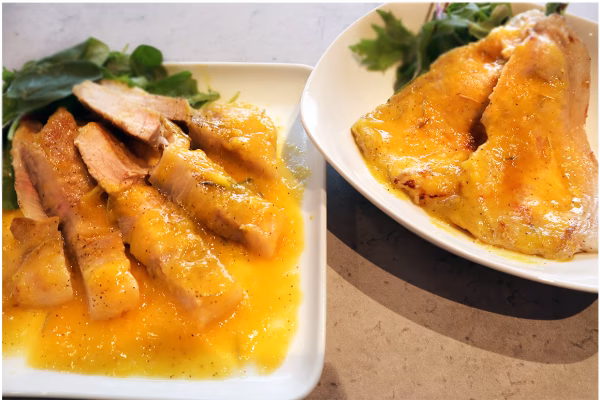 部位はロースとなり、適度に脂身があります。市場には出回らない希少な品種で甘みがあり、酸味のあるみかんソースと相性が良いです。