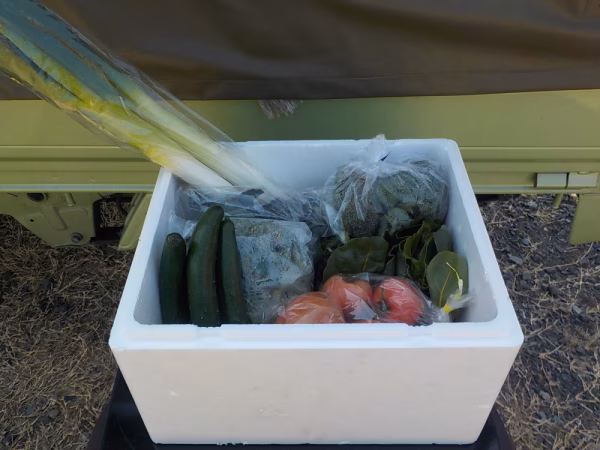 内容は出荷日当日の朝、畑に出て一番状態の良いものを少なくとも15種類以上、80サイズの箱に入るだけ詰め込んで出荷します。