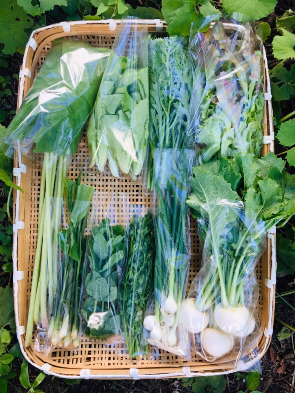 玉ねぎ、にんにく、ローズマリー、ニラ、ミディトマト、ミニトマト、甘長トウガラシ、ししとう、ピーマン、じゃがいも(男爵、メークイン)、おかわかめ、春菊、菜花、つるむらさき、バターナッツ、スクナカボチャ、西洋人参、生姜、モロッコインゲン、みやま小かぶ、ベビーリーフ、落花生、ねぎ、わけぎ、葉大根、ほうれん草、小松菜、とうがらし、里芋(石川早生、大野芋)、ルッコラ、ラディッシュ、のらぼう菜、ヤーコン、ふき、ふきのとう、みょうが、みょうがだけ、タラの芽、キャベツなど。