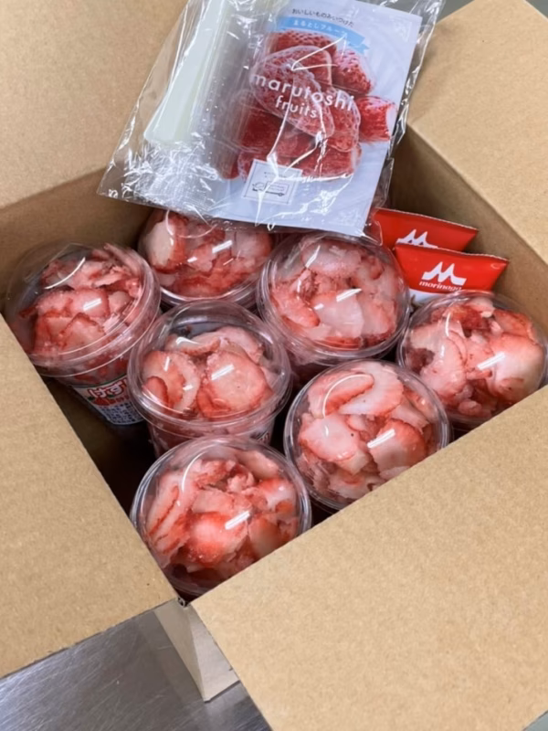 完熟&採りたてのいちごを食べやすいようヘタ取りし、美味しさを損なわないよう急速冷凍した後、舌触りが滑らかで、いちごの美味しさを一番感じられる薄さを研究いたしました!!!