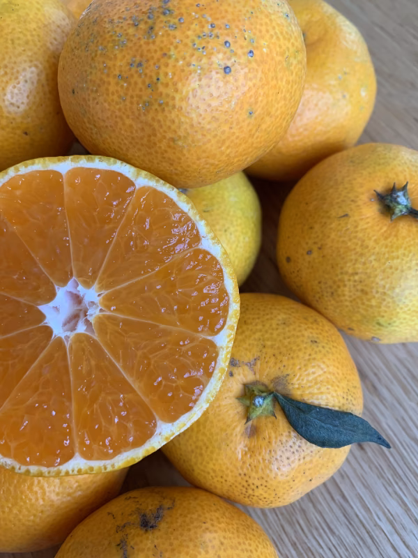 極早生は、お届け時は青さが残ってますが、数日で黄色に色づきます。早めにお召し上がりいただき、フレッシュな柑橘の香りと味をお楽しみください。