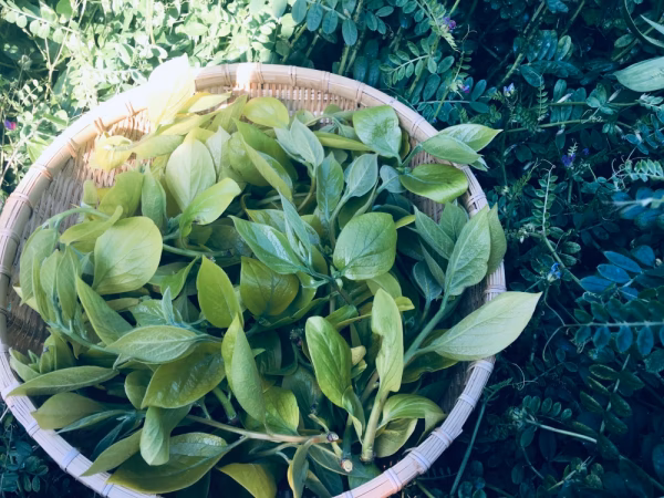 柿の木の下に、ふき、ミョウガを混植する方法で、栽培しています。最近は、アグリフォレスト農法(無肥料、無農薬、無除草剤)と言われるやり方です。
