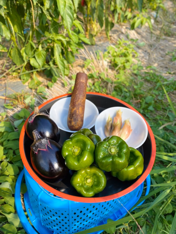 味噌を炒め、砂糖で味を整えたところに、素揚げしたぼたんこしょうと丸なすを合わせる、味噌炒めのようなもの。