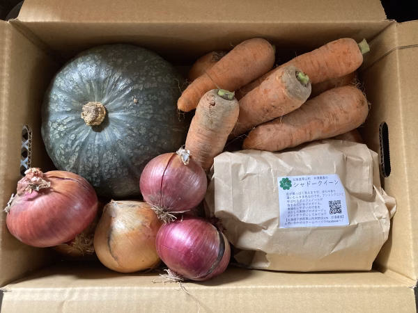 かぼちゃ1玉、じゃがいも1品種を700g、にんじん5〜7本、玉ねぎ2種を5kg箱に入るだけをセットにしました!