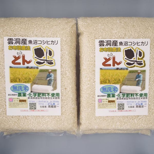 どんとぴあファームでは水稲栽培を行うにあたり、直播き(水田に直接種子を播く方法)を、ちょっとエコなお布団農法(布マルチ直播栽培)で実現しました。また栽培期間中、農薬不使用・化学肥料不使用の県認証特別栽培玄米を使用しています。栽培しているのは、“愛”の兜(直江兼続)ゆかりの地(南魚沼市雲洞)で、兜の文字に負けず劣らず“愛情”いっぱい育てたその雲洞産魚沼コシヒカリ「どん米」を、美味しさそのままキープの無洗米1.2kg真空パックにしましたので、保存性に優れています。