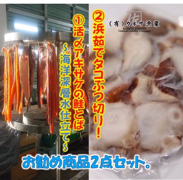 人気の浜茹でタコ足のぶつ切りと活〆アキサケの鮭とばのセットです。
